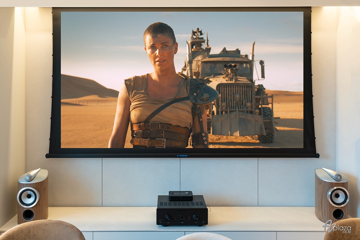 설치에는 영국을 대표하는 스피커 제조사 B&W(Bowers & Wilkins) 805 D4와 덴마크 하이파이 제조사 코플랜드(Copland) 플래그십 인티앰프 CSA150을 매칭하였습니다. 소스기기는 블루사운드(Bluesound) 노드3(Node 3) 네트워크 플레이어를 사용하였습니다. 대화면 구현을 위해 옵토마(Optoma) UHZ65LV와 윤씨네(Yuncine) 106인치 전동텐션 스크린을 사용하였습니다.