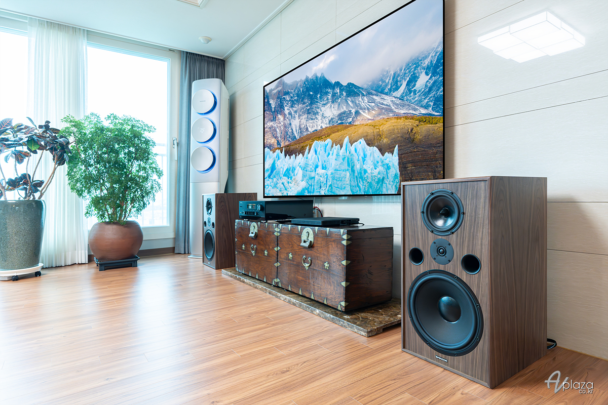 설치에는 영국 스피커 제조사 스펜더(Spendor) 클래식 시리즈 상위 두 번째 모델인 클래식 100(Classic 100)과 야마하(Yamaha) R-N2000A 네트워크 인티앰프 블랙에디션을 매칭하였습니다. 스탠드는 고객님이 별도로 특주한 제품이 도착하지 않아 바닥에 설치하였습니다.