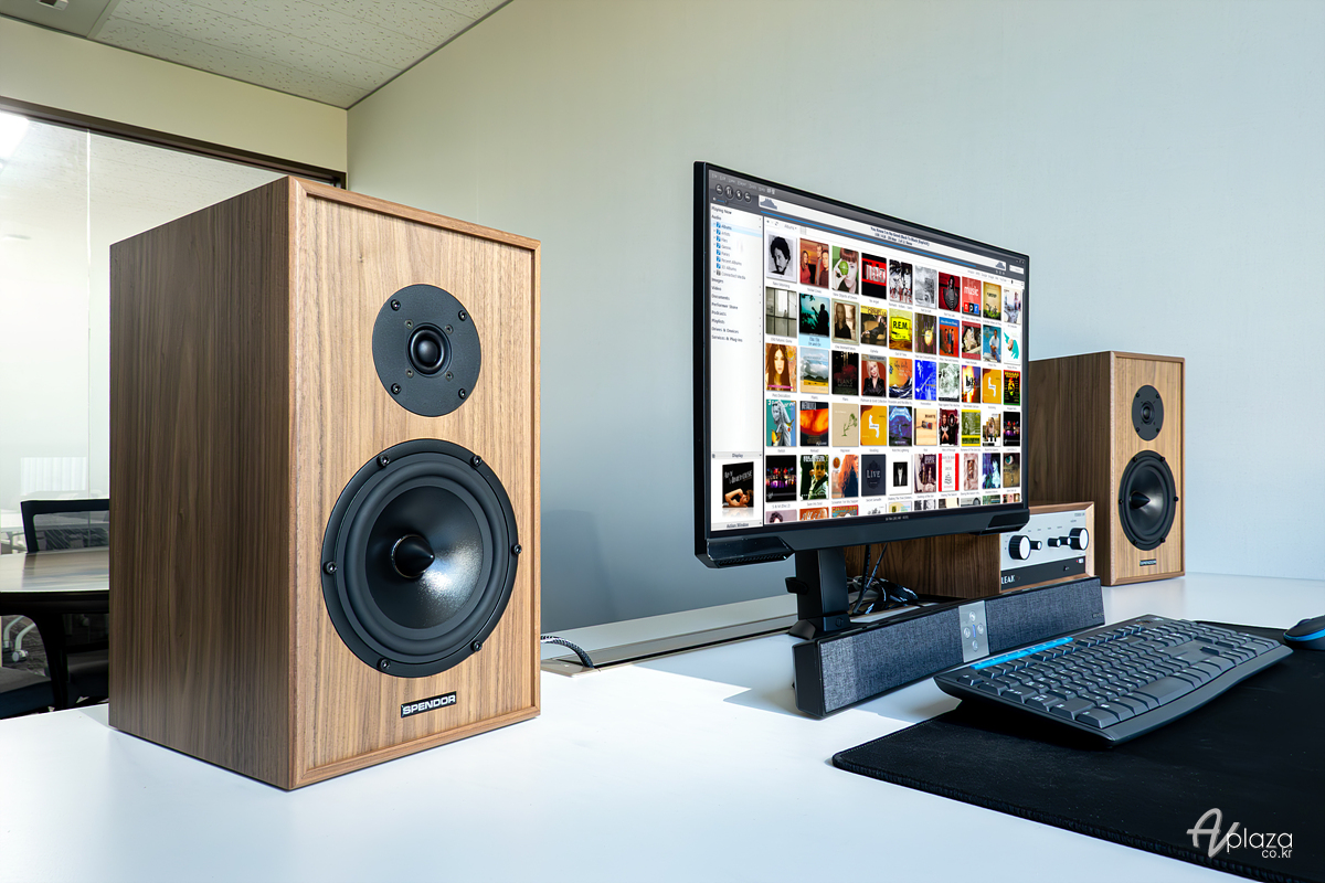 설치에는 영국 스피커 제조사 스펜더(Spendor) 클래식 시리즈 중 클래식 3/1 스피커와 리크오디오(Leak Audio) 스테레오 130(Stereo 130) 인티앰프를 매칭하였습니다. 별도의 소스기기 대신 사무실에서 사용하시는 PC와 USB로 연결해드렸습니다.
