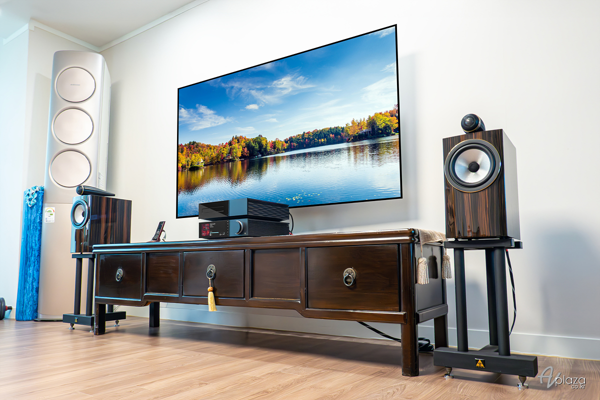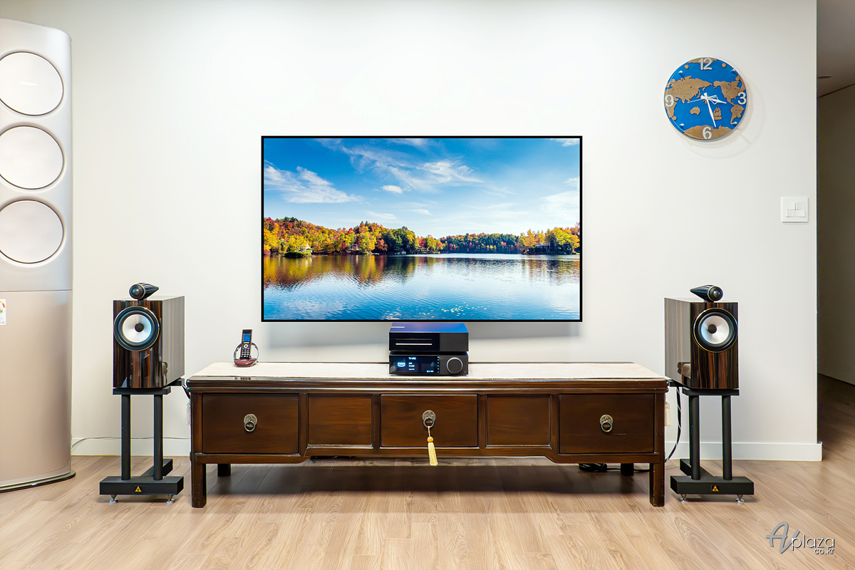 설치에는 영국을 대표하는 스피커 제조사 B&W(Bowers & Wilkins) 705 S3 시그니처 미드나잇 다툭 글로스(Datuk Gloss)와 캠브리지오디오(Cambridge Audio) 에보 150 SE(Evo 150 SE) 올인원 인티앰프를 매칭하였습니다. 또한 CD 재생을 위해 에보 CD(Evo CD) CD 트랜스포트를 사용하였습니다.