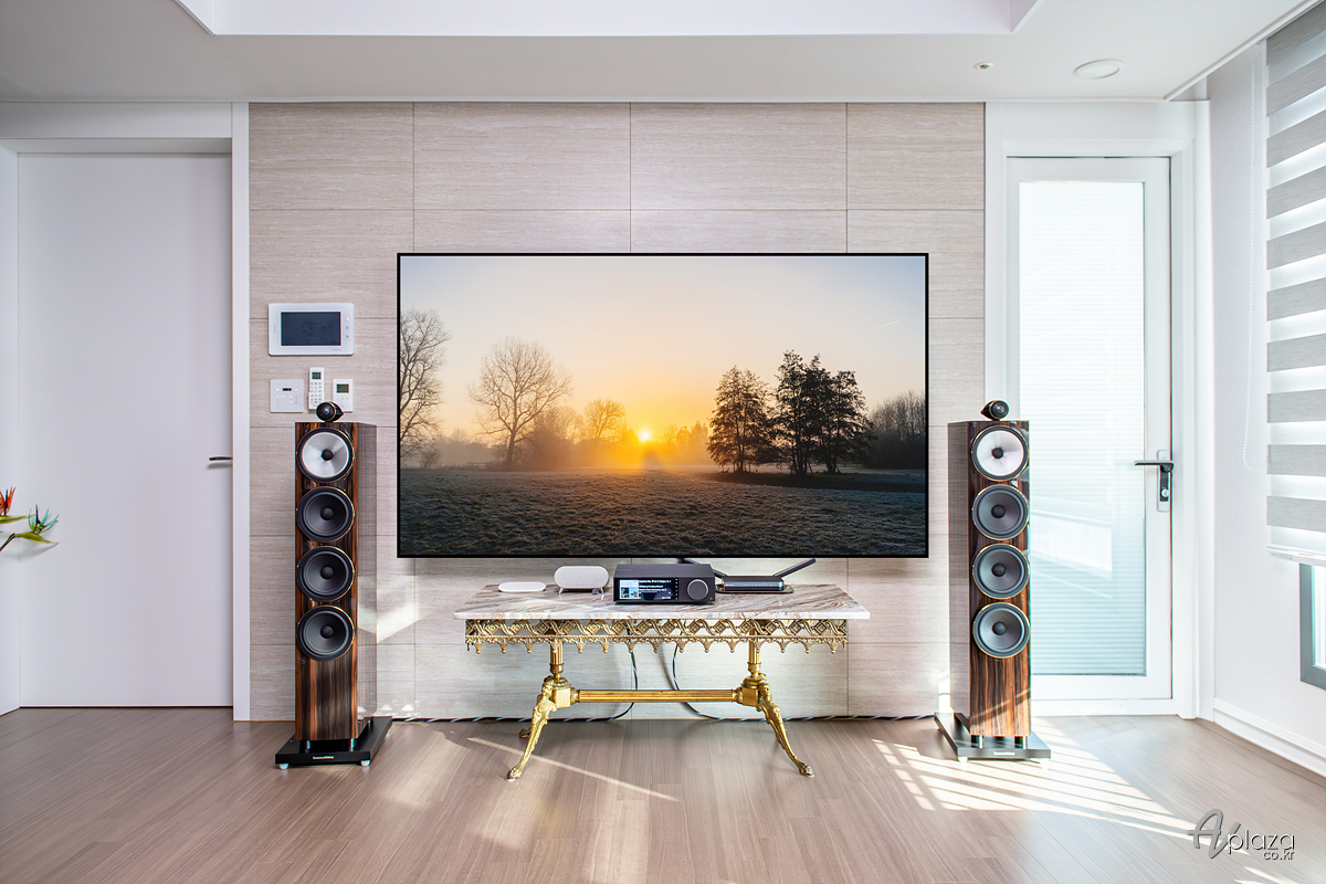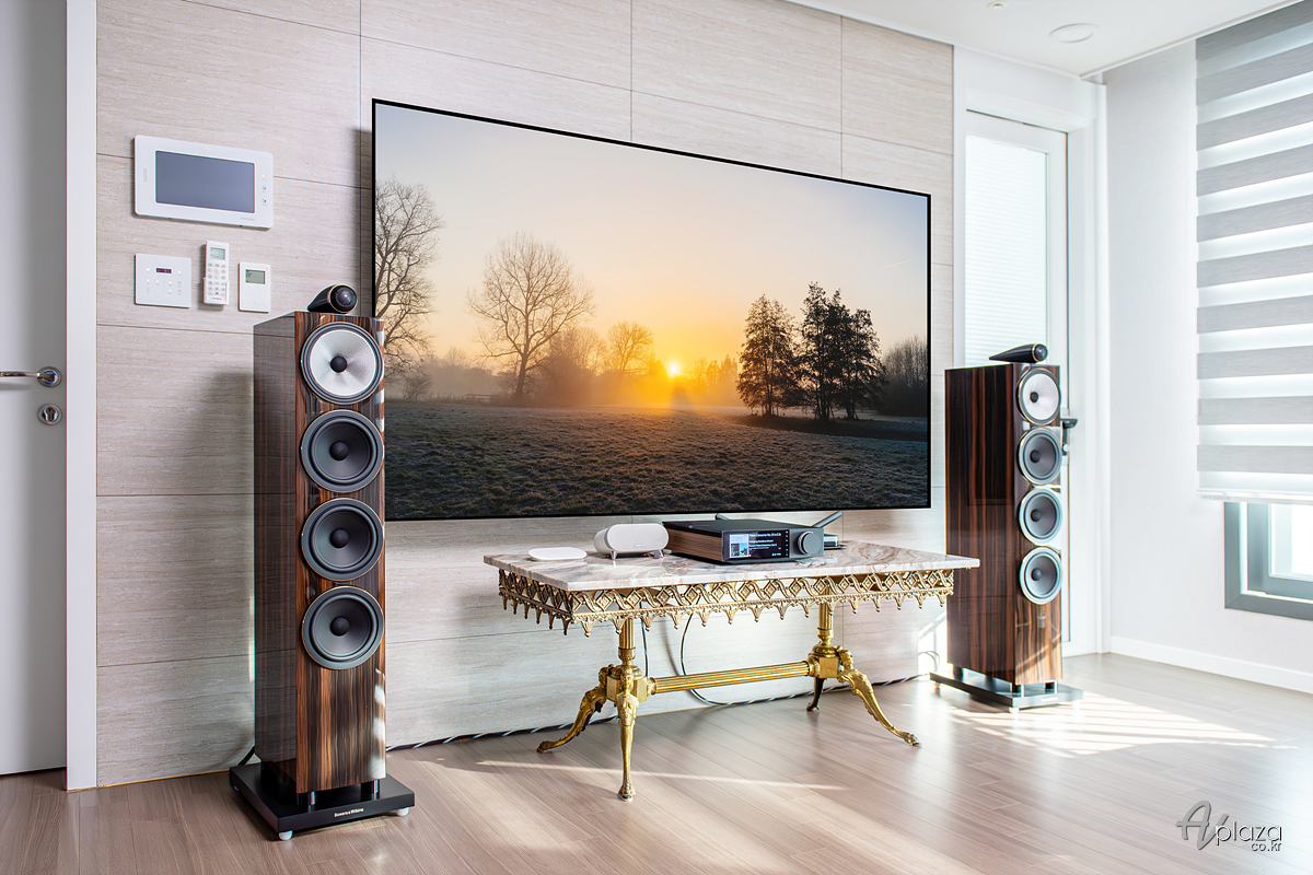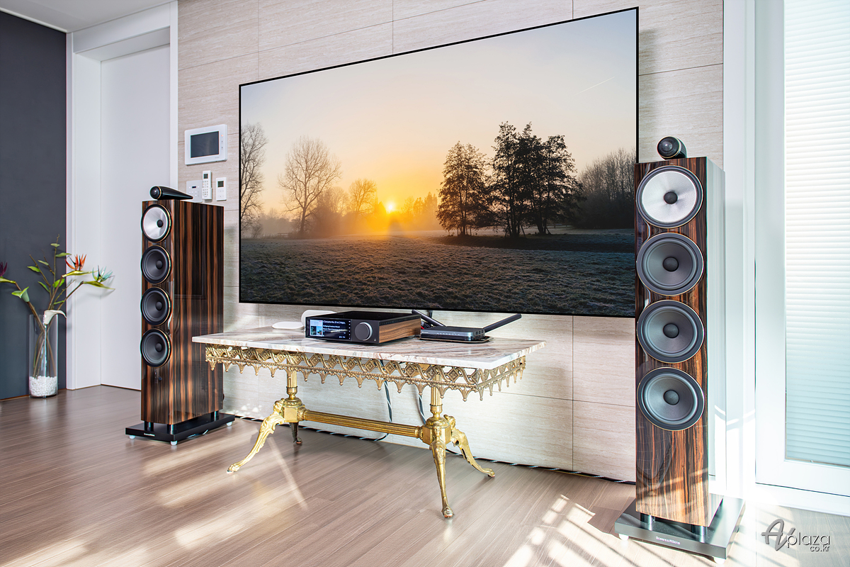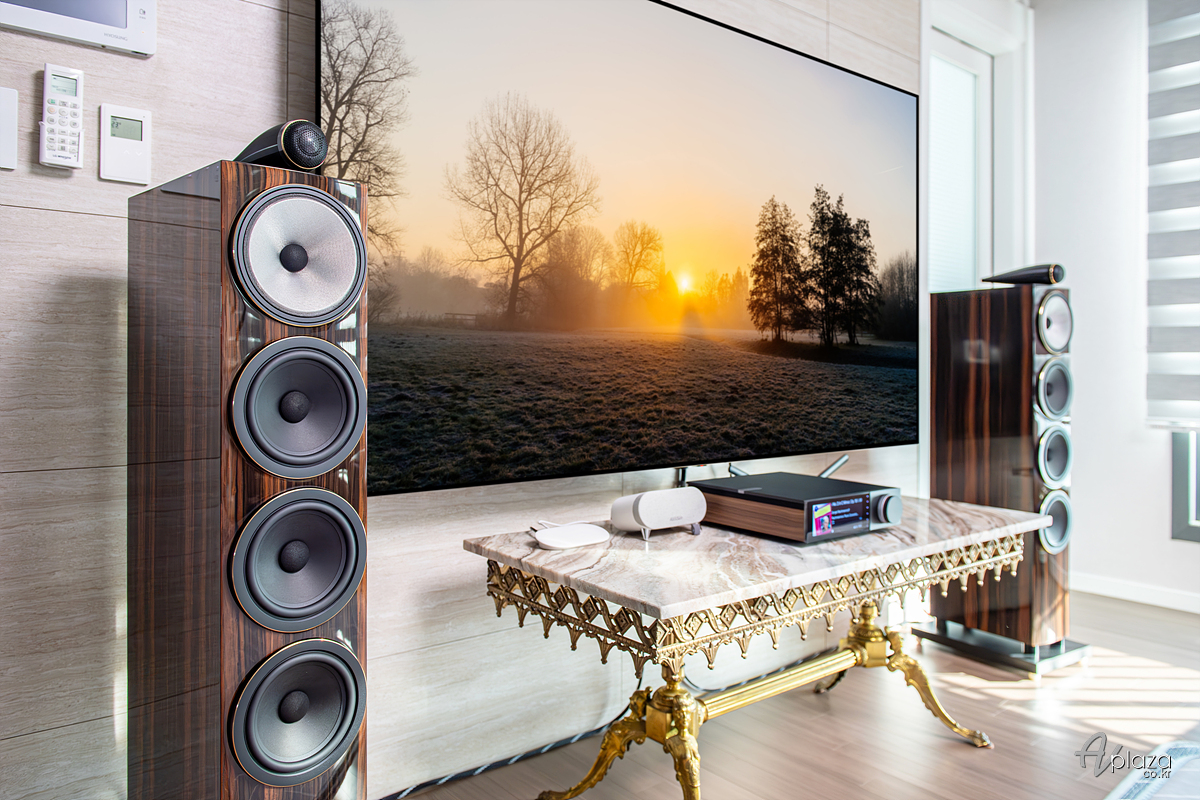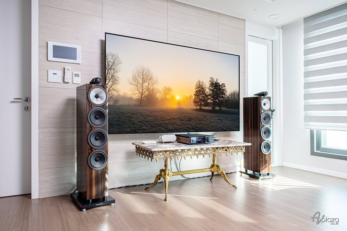 설치에는 영국을 대표하는 스피커 제조사 B&W(Bowers & Wilkins) 702 S3 시그니처 다툭 글로스(702 S3 Signature Datuk Gloss) 플로어스탠딩 스피커와 영국 하이파이 제조사 캠브리지오디오(Cambridge Audio) 네트워크 올인원 인티앰프 에보 150 SE(Evo 150 SE)를 매칭하였습니다.