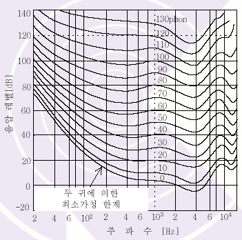 좌측편의 40hz쪽을 잘 보세요. 거기서 40db로 출력하더라도 사람은 멍청하게 소리가 나는지 안나는지 모른다는 것이죠. 40hz의 소리는 적어도 50db이상의 소리가 나야 느낄가 말까 한다는 것입니다. ( 두귀의 최소가청한계선 이하는 안들린다는 의미)