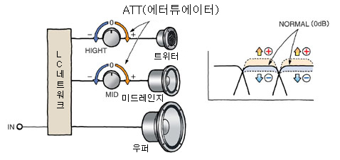 이것을 이용하여 트위터는 더 높은 대역대의 소리를 내게 할수 있고 저역대는 더 깊은 소리를 낼수 있게 조절 가능하도록 한 장치 입니다.