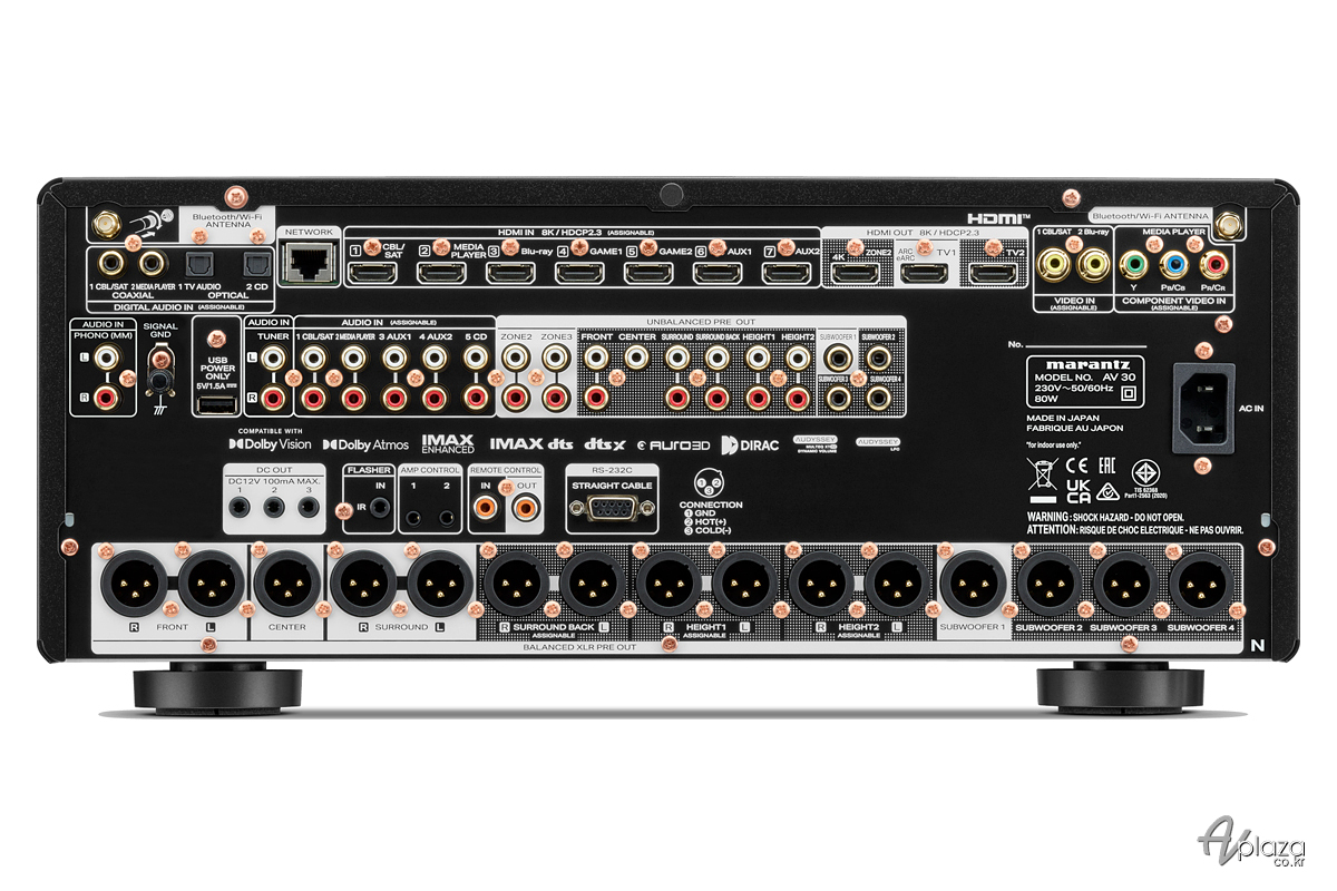 AV30 AV 프로세서는 아날로그 디바이스(Analog Devices)의 강력한 샤크(SHARC) 듀얼코어 DSP 칩셋과 32비트 DAC를 탑재해 정밀한 오디오 디코딩을 수행합니다. 돌비 애트모스(Dolby Atmos), 아이맥스 인핸스드(IMAX Enhanced), DTS:X, 오로 3D(Auro-3D) 등 최신 서라운드 포맷을 완벽히 지원합니다.