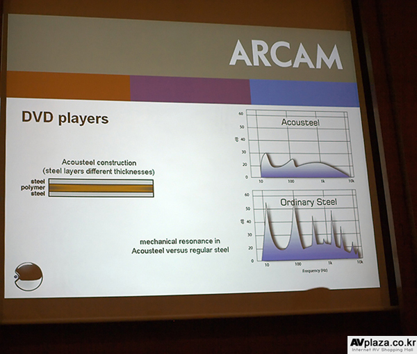 위 차트는 일반 스탠래스 스틸 제질의 케이스와 알루미늄+polymer 를 결합시킨 acousteel 케이스의 진동 억제에 대한 차이점을 나타낸 그래프입니다. 그래프에서 보시듯이 acousteel 케이스가 일반 스탠래스 스틸 케이스보다 매끈하게 나오는 반면 일반 케이스는 날쑥하는 것을 알 수 있을겁니다. 이는 플레이어에서 발생하는 진동을 자체 개발한 케이스만으로도 훌륭히 억제 할 수 있다는 것을 보여주는 것으로 케이스 하나도 대충 만들지 않는다는 ARCAM 의 철학을 또 한번 확인 할 수 있는 기회였습니다. 사용자가 플레이어의 공진을 막기위해 악세사리를 따로 구입할 필요가 없다는 것도 큰 장점중 하나입니다.