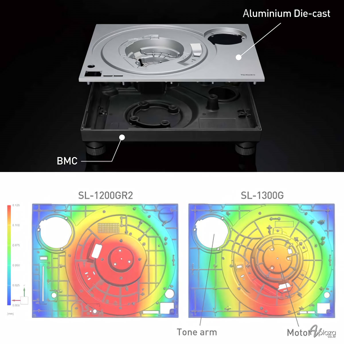 본체는 다이렉트 드라이브 모터, 플래터를 지지하고 외부로부터의 진동을 경감하기 위해 섀시 역시 고강성화하였습니다. 벌크 몰딩 컴파운드(BMC, Bulk Molding Compound)와 알루미늄 다이캐스트 섀시를 일체화한 2층 구조 알루미늄 다이캐스트 섀시는 모터/톤암부 사이에 보강 리브를 추가하여 강성을 높였습니다. 이를 통해 모터에서 발생하는 미세한 진동이 톤암부에 영향을 미치지 않도록 설계하였습니다.