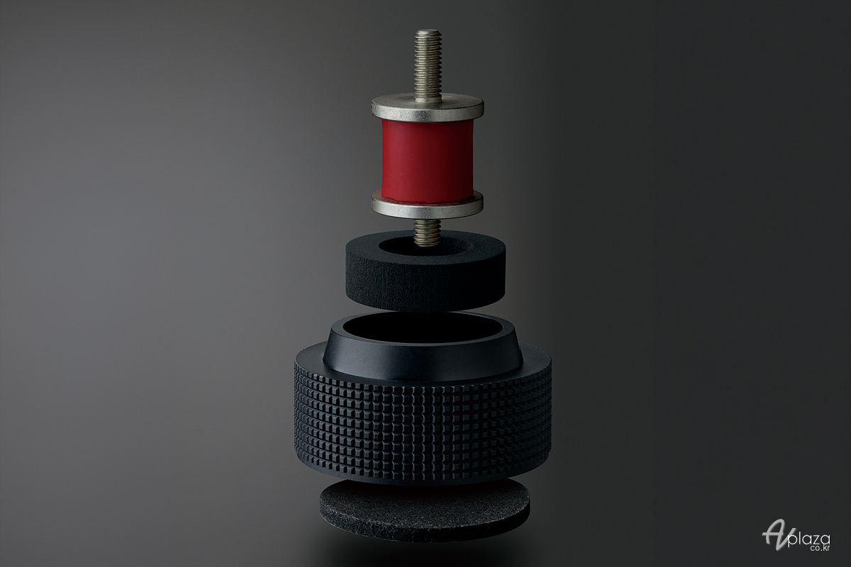 케이스를 지지하는 인슐레이터는 높은 진동 감쇠 특성과 장기사용의 신뢰성을 갖춘 특수 실리콘 러버를 채용하였습니다. 고강성 가공 볼트와 함께 성형된 구조로 종방향의 진동을 마이크로셀 폴리머를 통해 원통형 튜브로 횡방향의 진동을 억제합니다. 이들 부품은 강화 수지 하우징에 수납됩니다. 특수 실리콘 고무의 경도는 본체 중량에 맞춰 튜닝하였습니다.