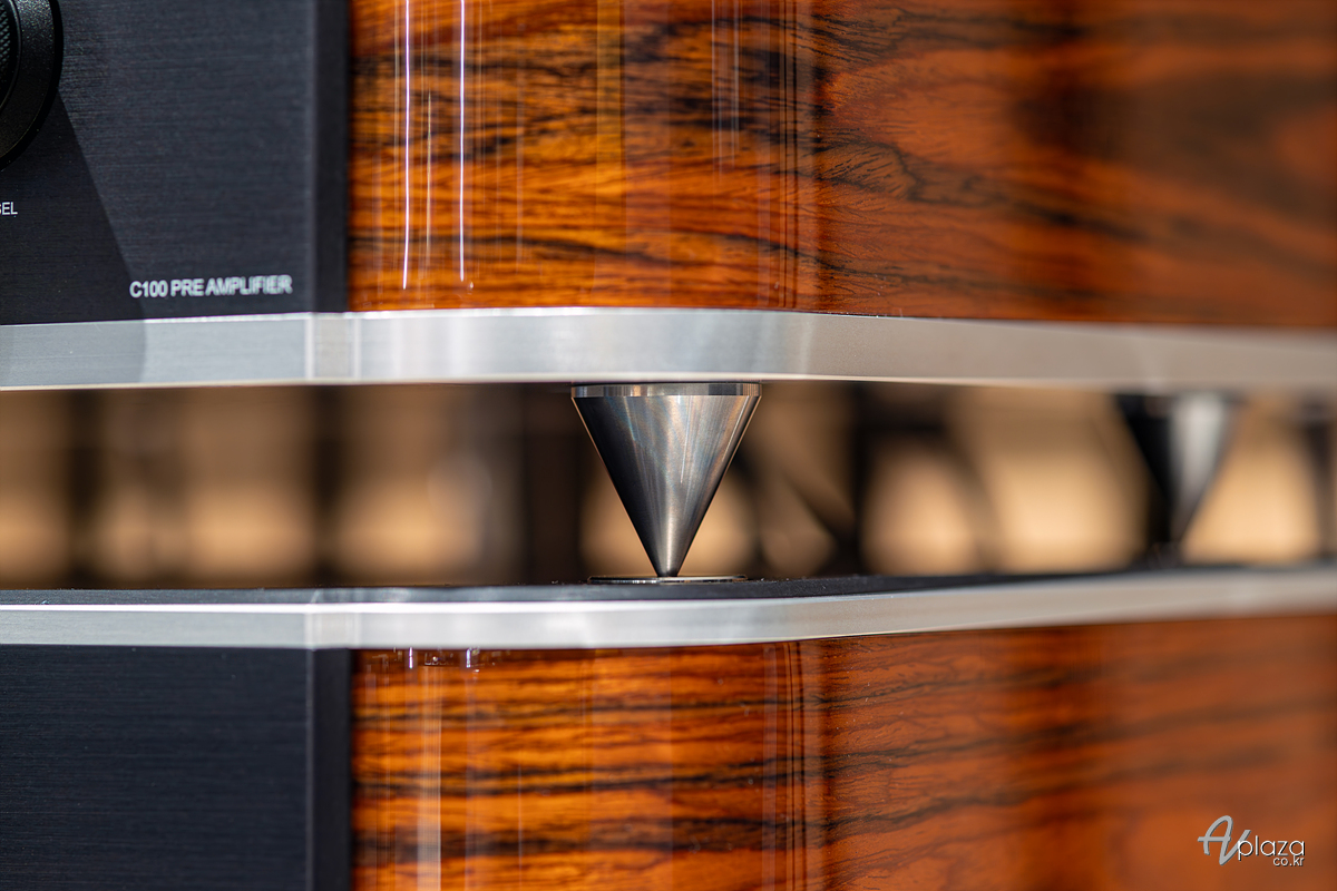 외관 및 설계 역시 하이엔드 기기다운 견고함과 심미성을 동시에 갖추고 있습니다. 진동 제어를 위해 정밀 가공된 섀시는 외부 노이즈 유입을 원천 차단하여 칠흑 같은 배경의 정막감을 선사하며, 내부 부품 배치 하나까지도 최단 신호경로를 고려하여 설계되었습니다. 모델 C100은 단순한 프리앰프를 넘어, 전체 시스템의 음악적 투명도와 완성도를 결정짓는 마스터피스로서 오디오파일들에게 깊은 신뢰를 주는 제품입니다.