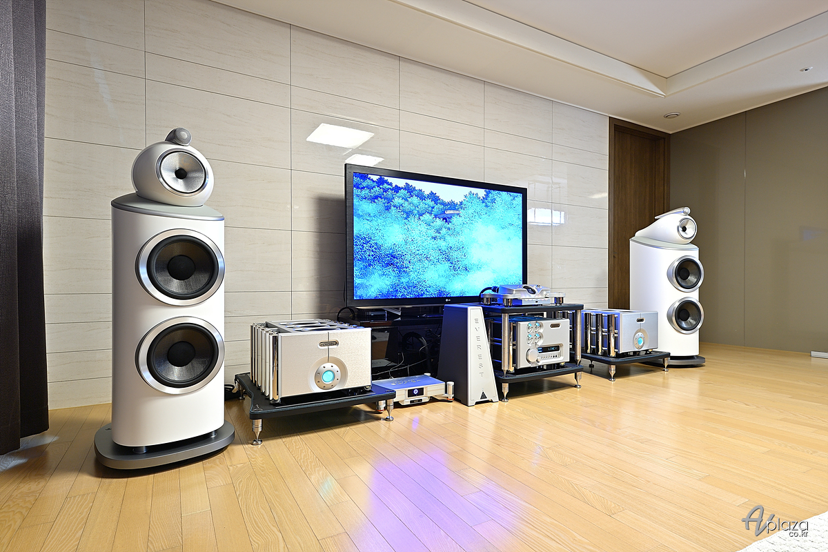 설치에는 영국을 대표하는 스피커 제조사 B&W(Bowers&Wilkins)의 플래그십 모델인 801 D4와 영국 하이파이 제조사 코드 일렉트로닉스(Chord Electronics)의 플래그십 울티마 프리(Ultima PRE) 프리앰프와 플래그십 모노블럭 파워앰프 울티마(Ultima)를 매칭하였습니다. 소스기기는 코드 일렉트로닉스의 플래그십 DAC 데이브(Dave)에 고객님이 보유하고 계시던 음악재생용 PC를 USB로 연결하였습니다.