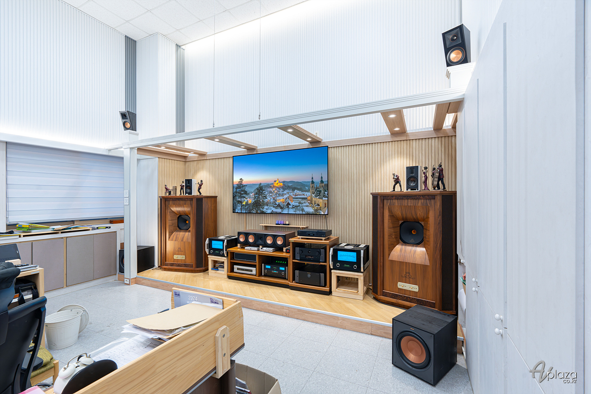 설치에는 영국 스피커 제조사 탄노이(Tannoy) 프레스티지 골드 레퍼런스 시리즈 플래그십 모델인 웨스트민스터 로얄 GR(Westminster Royal GR)과 미국을 대표하는 하이파이 제조사 매킨토시(McIntosh) C2800 진공관 프리앰프, MC1.25KW 모노블럭 파워앰프를 매칭하였습니다. 디지털 소스기기는 코드 일렉트로닉스(Chord Electronics) 휴고 TT2(Hugo TT2), M 스케일러(M Scaler)에 하이파이로즈(Hifirose) RS130 네트워크 트랜스포트를 사용하였습니다. 홈시어터 시스템 업그레이드를 위해 마란츠(Marantz) 플래그십 모델인 AV10 AV 프로세서와 AMP10 멀티채널 파워앰프를 사용하였습니다.