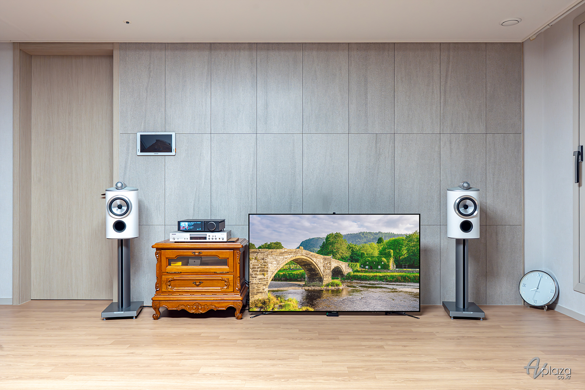 설치에는 영국을 대표하는 스피커 제조사 B&W(Bowers & Wilkins) 800 시리즈 다이아몬드(800 Series Diamond) 제품 중 805 D4 북셀프스피커와 캠브리지오디오(Cambridge Audio) 네트워크 올인원 인티앰프 에보 150(Evo 150)을 매칭하였습니다. B&W 805 D4 스피커는 전용 스탠드를 함께 설치하였습니다.