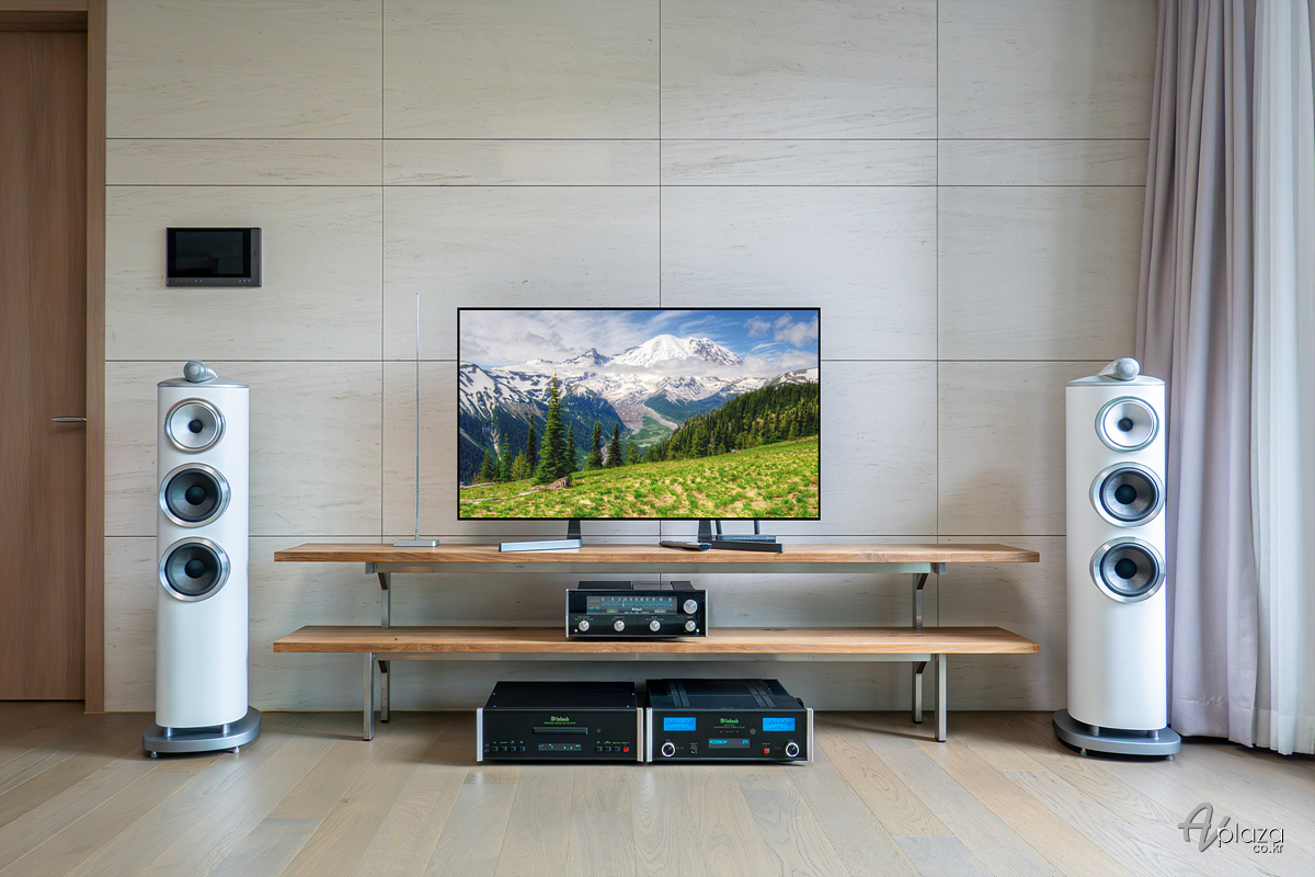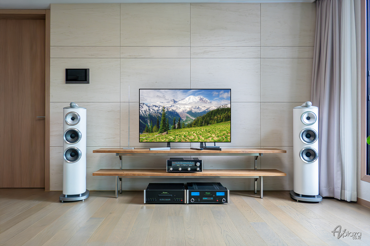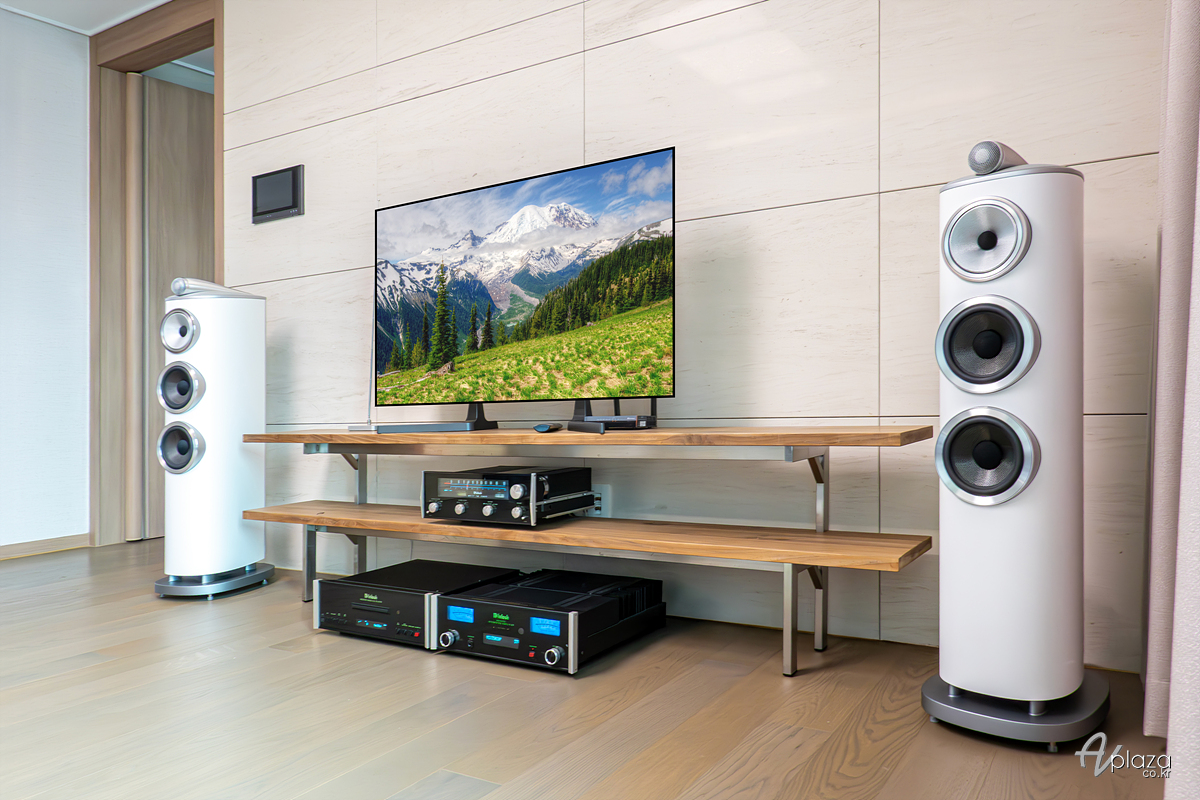 설치에는 영국을 대표하는 스피커 제조사 B&W(Bowers & Wilkins) 800 시리즈 다이아몬드(800 Series Diamond) 제품 중 804 D4와 미국을 대표하는 하이파이 제조사 매킨토시(McIntosh) MSA5500 스트리밍 인티앰프를 매칭하였습니다. 소스기기는 매킨토시 MCD350 SACD/CD 플레이어를 사용하였습니다. 이외에 고객님이 보유중이신 매킨토시 MR77 튜너를 함께 세팅해드렸습니다.