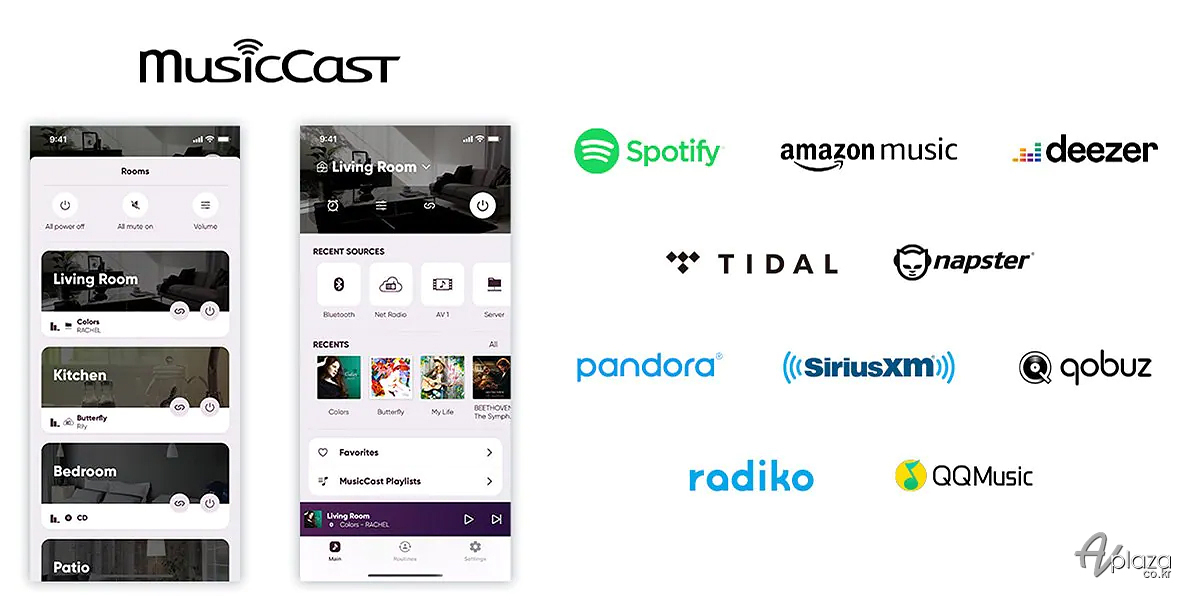 뮤직캐스트 스트리밍 및 멀티룸 오디오 플랫폼은 AV 리시버, 무선 스피커, 사운드 바 등 다양한 제품에 내장되어 있습니다. 홈 네트워크 또는 블루투스(Bluetooth)를 통해 음악을 스트리밍할 수 있으며, 구글 어시스턴트(Google Assistant), 아마존 알렉사(Amazon Alexa)의 음성제어와 애플 에어플레이2(Apple AirPlay 2)를 지원합니다. 이 모든 기능은 스마트폰 또는 태블릿 앱을 통해 제어할 수 있습니다.