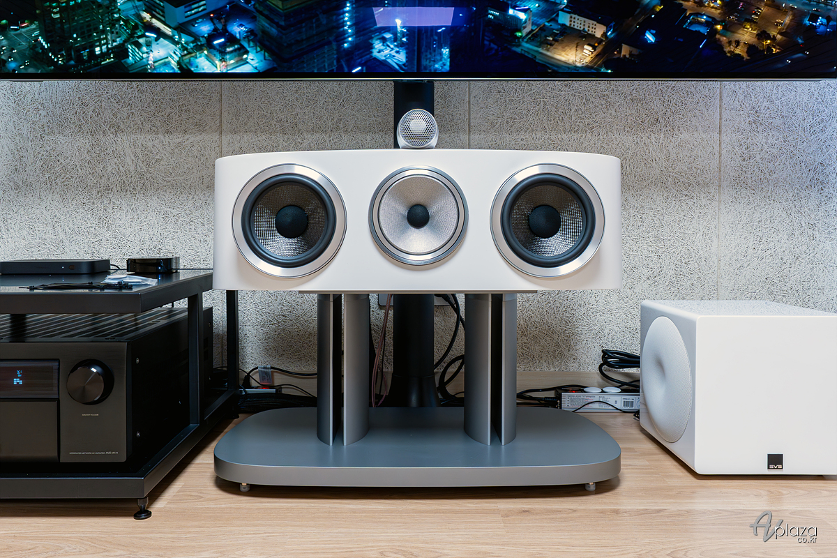 B&W HTM82 D4 센터스피커의 모습입니다. 전용 스탠드를 사용하여 일체감을 높였습니다.