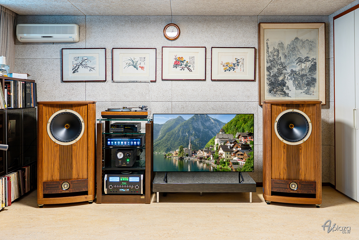 설치에는 영국 스코틀랜드 스피커 제조사 파인오디오(Fyne Audio)의 새로운 플래그십 라인업인 빈티지 시리즈(Vintage Series) 제품 중 빈티지 피프틴(Vintage Fifteen)과 미국을 대표하는 하이파이 제조사 매킨토시(McIntosh) MA12000 플래그십 인티앰프를 매칭하였습니다. 디지털 소스기기는 하이파이로즈(Hifirose) RS151 네트워크 플레이어를 사용하였습니다. 이외에 고객님이 보유중인 기기들을 함께 세팅해드렸습니다.