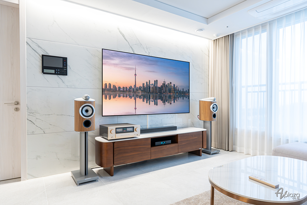 설치에는 영국을 대표하는 스피커 제조사 B&W(Bowers & Wilkins) 800 시리즈 다이아몬드(800 Series Diamond) 제품 중 805 D4 북셀프스피커와 일본 하이엔드 제조사 아큐페이즈(Accuphase) E-4000 인티앰프를 매칭하였습니다. 소스기기는 루민(Lumin) D3 네트워크 플레이어를 사용하였습니다.