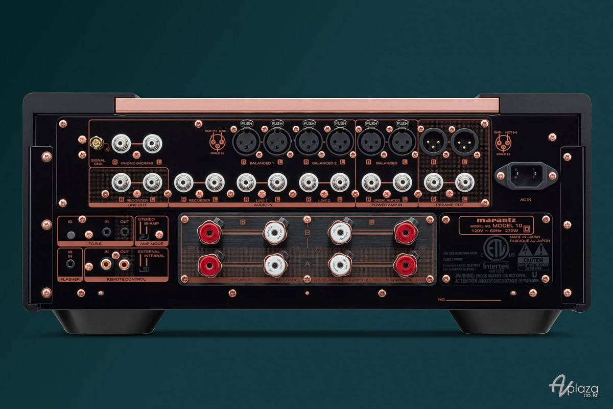 아날로그 애호가를 위한 MM/MC 포노 입력단이 탑재되어 있으며, 카트리지 임피던스 설정도 세밀하게 조정할 수 있어 고급 턴테이블 시스템과의 매칭에서도 탁월한 유연성을 보여줍니다. 알루미늄 전면 패널과 대형 VU 미터, OLED 디스플레이가 조화를 이루는 디자인은 고전적인 마란츠 감성과 현대적 세련미를 함께 담고 있습니다. 마란츠 모델 10은 단순히 힘이 좋은 인티앰프가 아니라, 정밀한 회로 설계와 미학적 완성도, 그리고 순수한 사운드 표현력까지 모두 겸비한 진정한 하이엔드 오디오파일용 앰프로 손색이 없는 제품입니다.