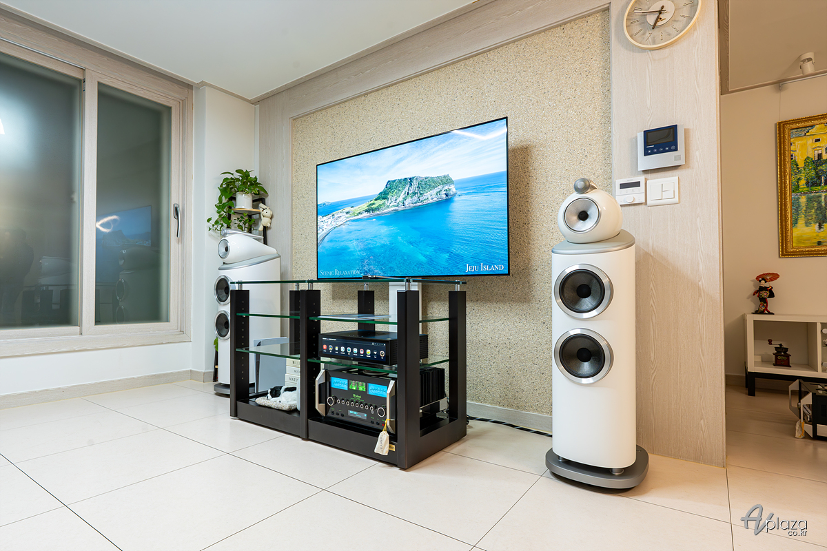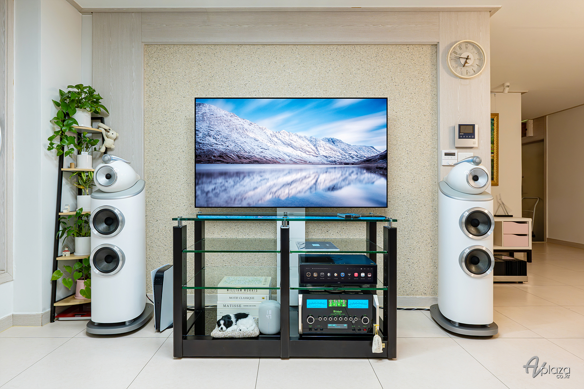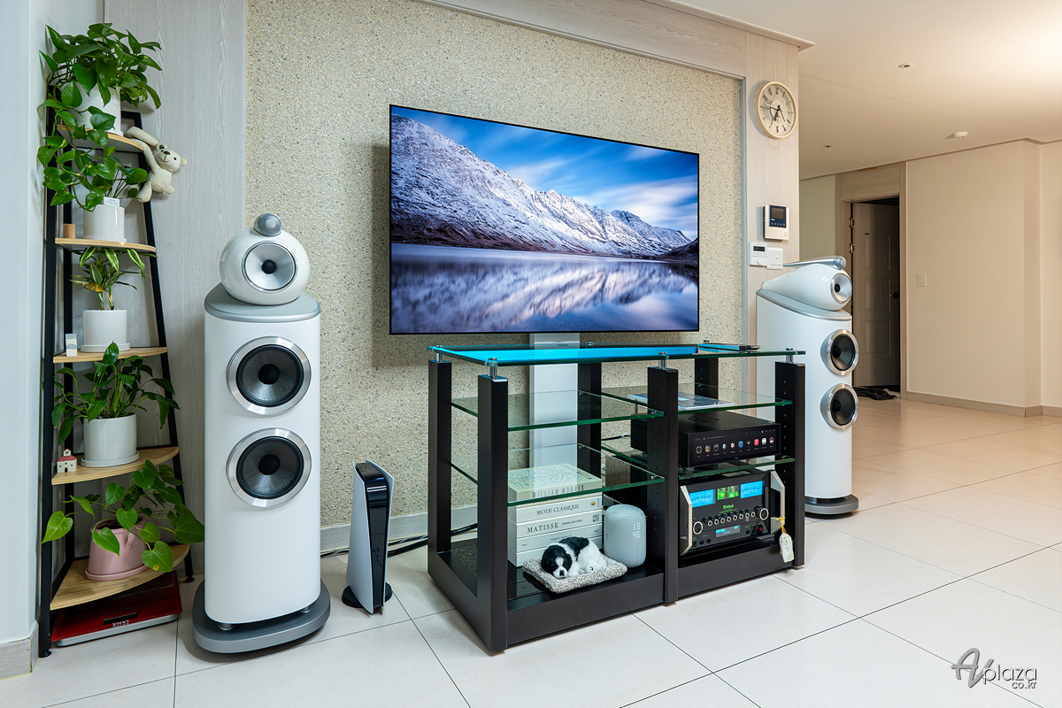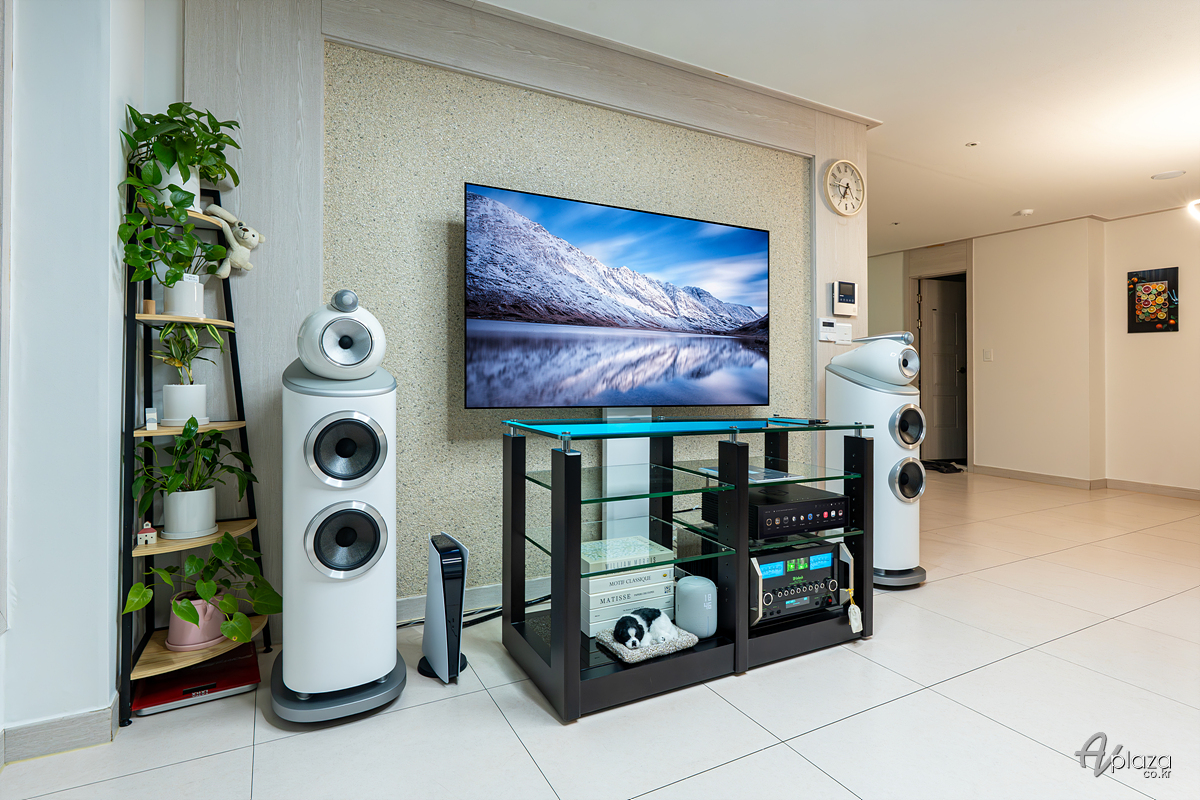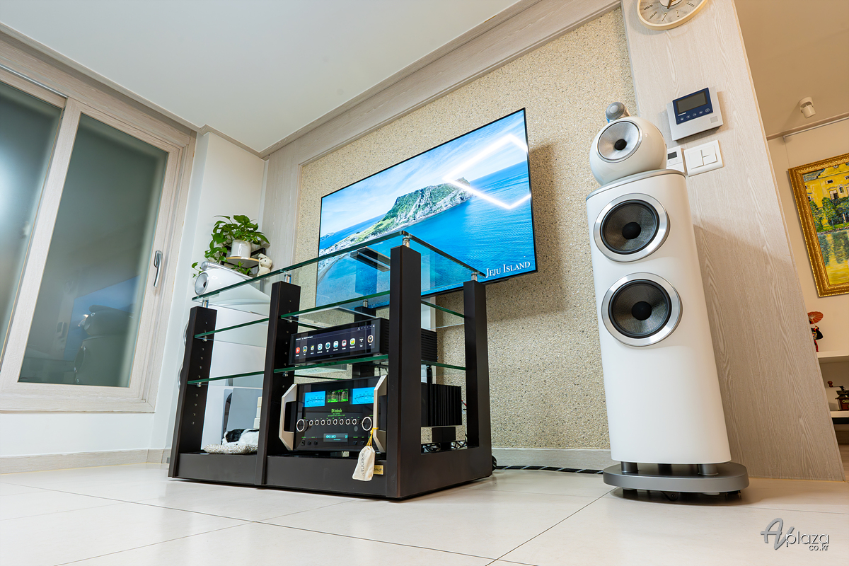 설치에는 영국을 대표하는 스피커 제조사 B&W(Bowers & Wilkins) 800 시리즈 다이아몬드(800 Series Diamond) 제품 중 803 D4 스피커와 미국 하이파이 제조사 매킨토시(McIntosh) MA12000 플래그십 인티앰프를 매칭하였습니다. 소스기기는 하이파이로즈(Hifirose) RS151 네트워크 플레이어를 사용하였습니다.