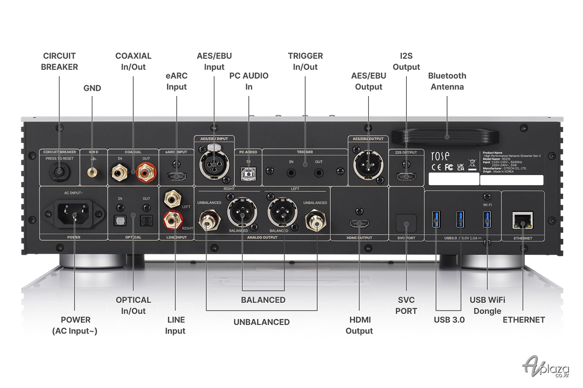 확장성과 만듦새 또한 하이엔드 소스기기로서 부족함이 없습니다. 통 알루미늄을 절삭 가공한 고강성 섀시는 진동과 열을 효과적으로 제어하며, 내부에는 고효율 리니어 전원부를 배치하여 깨끗한 전원을 공급합니다. 후면에는 HDMI eARC를 포함한 풍부한 디지털 및 아날로그 입출력 단자를 갖추고 있어 TV, CD 트랜스포트, 외장 DAC 등 다양한 기기와 연결하여 시스템의 허브 역할을 수행할 수 있으며, 최신 와이파이(Wi-Fi) 및 블루투스 5.4 모듈을 통해 무선 연결 안정성도 크게 강화되었습니다.