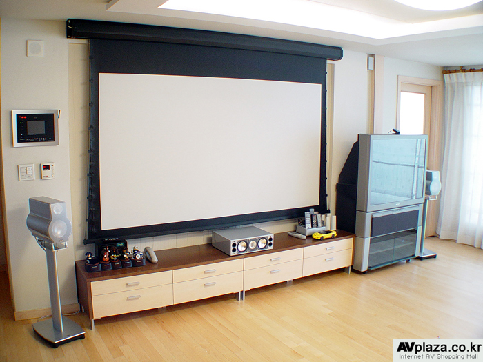 전면에 스크린은 렉스비전의 100인치 하이비전 전동 텐션 스크린입니다.